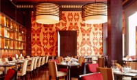 Signature oversized pendants were designed and manufactured specifically for the Rama Restaurant. Each pendant consists of a bronze skeleton, a silk fabric shade, walnut outer frame and an opal polycarbonate lower diffuser. The pendants incorporate dimmable opal lamps to back-illuminate the fabrics and asymmetric tungsten halogen uplights to illuminate the ceiling.