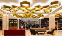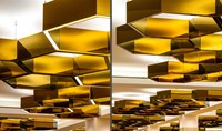 With the increase in destination shopping malls, competition is high. Having the right shops is only half the attraction; consumers want the overall experience to be one of visual stimulation and luxury. This was the premise behind the refurbishment of Sunset Walk at Centre MK in Milton Keynes, UK. The Hexagon pendants are a bespoke design, developed specifically from mirrored gold stainless steel to bring a sense of quality and high-end finish to the centre. The hexagon had to fulfil a number of specific criteria and were developed through a series of mock-ups to ensure they met all goals.