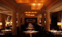 The rectangular fabric-and-wire ceiling mounted boxes, illuminated with 20W 12V capsule lamps fitted with amber glass-bead covers, were custom-designed to provide the main feature and a warm ambience at the V Restaurant. Tests were carried out with the light source and fabric prior to manufacture to ensure the desired effect was achieved.