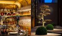The bar is approached via a corridor at the end of which sits the "Moon Garden" by the landscape architect Tom Stuart-Smith. This minimalist landscape has been carefully crafted to draw the guest into the scene through the star-lit water feature to the softly uplit cast brass Ilex crenata tree and shimmering moon beyond.