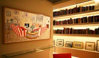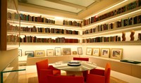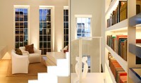 A clean contemporary mezzanine was created at the top of a very traditional building. Lit from within with LEDs, this semi transparent staircase is like a cool white ice cube. In contrast the shelves provide a warm light not only providing practical light to see the book spines but providing the main light in the room.