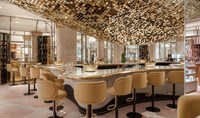 The sculpted central chandelier, composed of thousands of degradé golden metallic discs both sweeps and shimmers overhead, magnetically drawing one in as they reflect the light and theatre of the waiters or guests at the bar. The Nebuchadnezzar bottle of champagne at the bars centre is dramatically uplit by concealed miniature recessed uplights, that feature the bottle while also providing light and life to the feature ceiling.